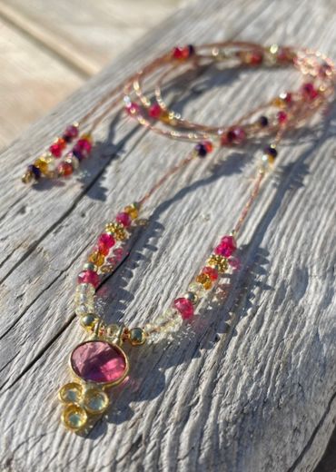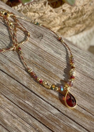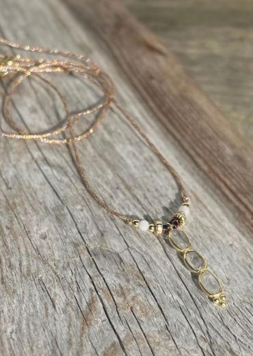 Ce sont des matériaux de qualité qui s'entremêlent pour faire naître des bijoux précieux et moins éphémères. Les métaux précieux côtoient la passementerie, les tissages d'or et d'argent, les perles et pierres fines. Du Lapis-Lazuli à la Labradorite en passant par l'Amazonite, la Pierre de Lune ou encore le Grenat, offrant différentes vertus et bienfaits grâce à leurs propriétés naturelles.