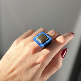 Descriptif de Bague large BLUE SANDSTONE Résine BLEUE - Cabochon carré doré du créateur Lucas Jack London