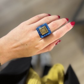 Les volumes de cette bague en font une exception ! L'anneau est large sous le doigt et s'évase pour former un carré sur le dessus du doigt. L'anneau est en résine de couleur bleue translucide. Au centre de la plateforme carrée se place 1 enchâssement carré lisse et doré en plaqué or.