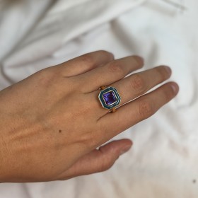 Découvrez l'élégance intemporelle avec cette bague en plaqué or fin 18 carats et 1 micron de haute qualité. Sa monture délicate et miimaliste met en valeur un enchâssement de forme hexagonal à l'émail couleur bleu canard sur son pourtour et inscrit d'une pierre en cabochon facetté ; un Quartz Améthyste violet lumineux.