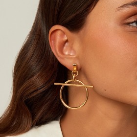Ces boucles d'oreilles sont conçues avec un plaqué or de haute qualité. Ce sont des créoles pour oreilles percées hypoallergéniques formées d'une puce design bombée pour l'attache aux lobes qui laisse pendre par une bélière ronde un anneau inscrit d'une barrette fixée transversalement sur la partie hauteur l'anneau pour former un décor unique.