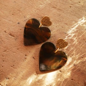 Des boucles d'oreilles en acier inoxydable plaqué or 18 carats et goldfilled pour les finitions, hypoallergéniques, pendantes, légères, composées du système tige et pince pour l'ajustement aux lobes et inscrites sur la tige d'un coeur doé qui retient un coeur en acétate de couleur écaille. Ces boucles d'oreilles sont parfaites au quotidien et illuminent vos visages en toutes occasions.