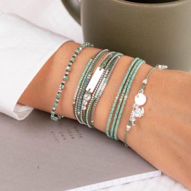Le bracelet élastique est en argent 925/1000 qualitatif et sans aucun problème pour votre peau. Il est monté sur un élastique très résistant. Ce bracelet alterne des perles en argent ciselées diamantées, des perles en Miyuki carrées de couleur verte et de petites perles en Hématites grises. Prenez la tangente avec ce bracelet élégant et féminin et soyez chic à tout moment !