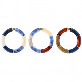 Ce bracelet est facile à enfiler, léger et confortable. Il est composé de tubes incurvés en résine acrylique de couleurs marron écaille, bleu marbré, ocre et pailleté doré, finition lisse et brillante, qui s'accumulent les uns à côté des autres, inscrit d'un anneau en acier doré gravé du logo de la marque.