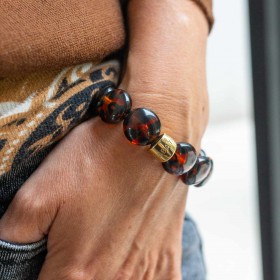 Craquez pour ce bracelet enfilé de perles ambre et noires façon léopard, un bracelet chaud et joyeux à porter en toutes circonstances