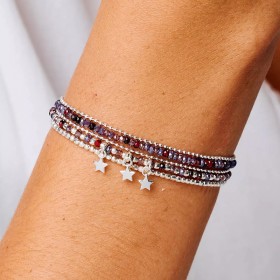 Sous le charme du style Doriane Bijoux, le bracelet élastique multirangs, violet, prune, argent et trois étoiles vagabondes pour une touche passion !