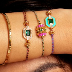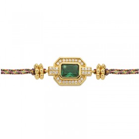 Ce bracelet ajustable propose un cordon fin multicolor pour inscrire un décor inspiré de la période Art-Déco avec son design graphique pour ajouter une touche chic et lumineuse grâce à ses pierre verte facettée et son encadrement scintillant de mini zircons blancs. Il allie glamour, lumière et modernité et très inattendu en toutes circonstances.