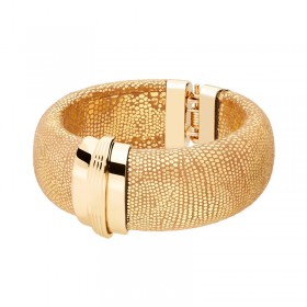 Il diffuse une lumière chaude et enveloppante, comme un rayon de soleil capturé autour de votre poignet. Sa texture reptile délicatement irisée crée un jeu de reflets subtils, évoquant la richesse des matitères naturelles et la profondeur des horizons lointains. Son design épuré, relevé d'une élégance baroque, glisse avec fluidité le long du poignet et accompagne hacun de vos gestes d'un bel éclat. A la fois moderne et intemporel, il dégage une présence qui volorise chaque tenue.