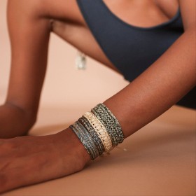 Ce bracelet incarne l'élégance artisanale marocaine avec une touche de modernité. Il est constitué de fils d'or finement brodés pour former un bracelet cordon scintillant. Le design se distingue par un tissage minutieux de fils tressés en petits ponts transversaux, créant un effet visuel unique et raffiné.