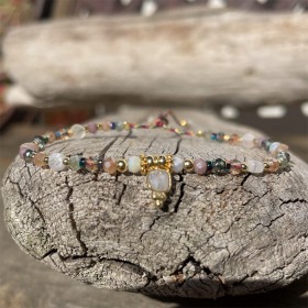 Ce bracelet de fabrication française artisanale est parfait pour sublimer votre style. Il est composé d'un rang et s'ajuste grâce au double cordon et noeud coulissant. Ce bracelet est agrémenté d'une Pierre de Lune, pierre fine sertie en argent925 plaqué or, de pierres fines en pierre de lune blanche et pêche, d'hématites, de perles de cristal et de perles en argent925 plaquées or.