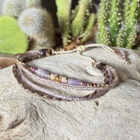 Ce bracelet de fabrication française artisanale est parfait pour sublimer votre style. Il est composé sur quatre rangs et s'ajuste grâce au double cordon et noeud coulissant. Il est agrémenté de perles fines en Améthyste lavande et de perles en Argent925 plaquées Or sur des cordons scintillants et une ruban de passementerie.
