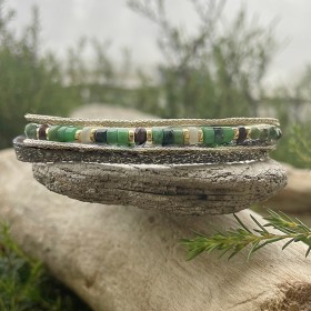 Ce bracelet de fabrication française artisanale est parfait pour sublimer votre style. Il est composé sur cinq rangs et s'ajuste grâce au double cordon et noeud coulissant. Il est agrémenté de perles fines en Jaspes vert et de perles en Argent925 plaquées Or sur des cordons scintillants et une ruban de passementerie.