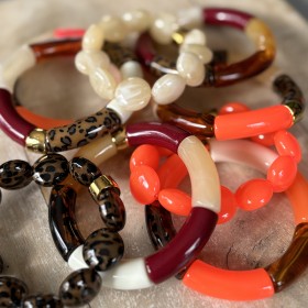 Craquez pour ce bracelet enfilé de tubes en résine, léopard blanc ivoire, écaille & corail : un bracelet à porter en toutes circonstances