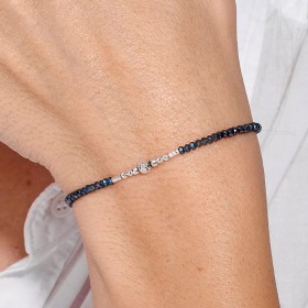 Le bracelet est en argent 925/1000 qualitatif et sans aucun problème pour votre peau. Il est monté sur un élastique très résistant. Vous le portez tout le temps, par tous les temps et toutes les occasions. Ce bracelet alterne des petites perles en argent ciselées diamantées, des perles de verre aux camaïeux de bleu et d'1 perle centrale diamantée.