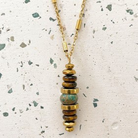 Une chaîne fantaisie dorée accompagnée d'un pendentif combiné en superposition de Jaspes feuille d'argent, d'Œil de Tigre et d'Hématites dorées.