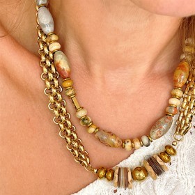 Ces colliers se dotent d'un assemblage et finition de haute qualité. Le choix des pierres semi-précieuses naturelles, sculptées ou pas aux couleurs chaleureuses apportent une richesse à votre silhouette !