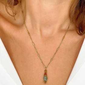 Une chaîne fantaisie dorée accompagnée d'un pendentif combiné en superposition de Jaspe rouge, de Agate Indienne et d'Hématites dorées.