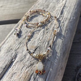 Ce collier de fabrication française artisanale est parfait pour sublimer votre style, sur cordon tressé couleur nude. Il est agrémenté d'une Pierre de Lune, pierre fine sertie en argent 925 plaquée Or, de perles de cristal et de perles en argent 925 plaquées Or.