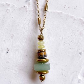 Le collier Lorette, un style idéal ! Un collier chaîne fantaisie et Pendentif de Pierres semi-précieuses, Jade et d'hématites dorées pour un style tendance et intemporel